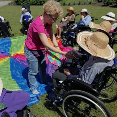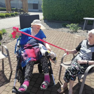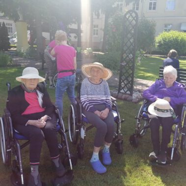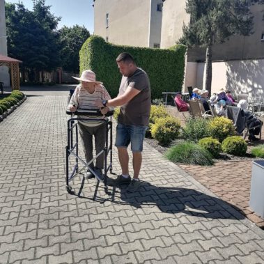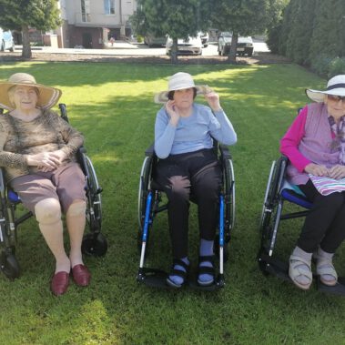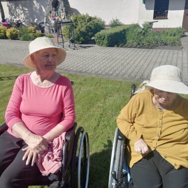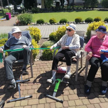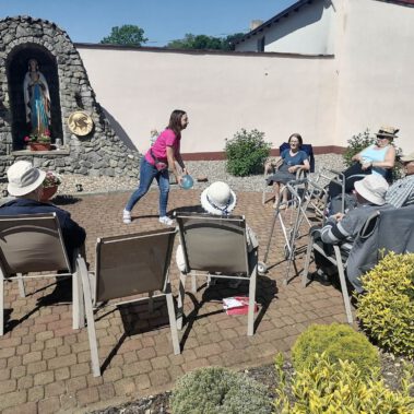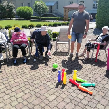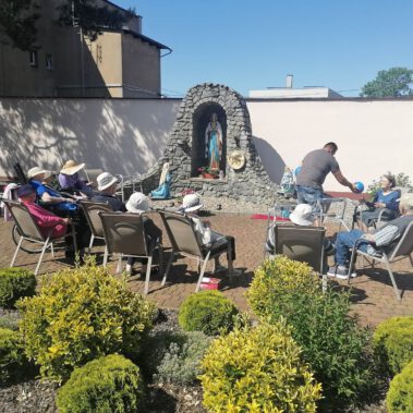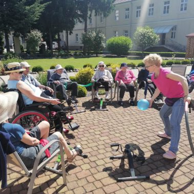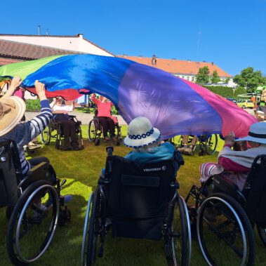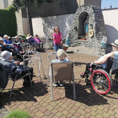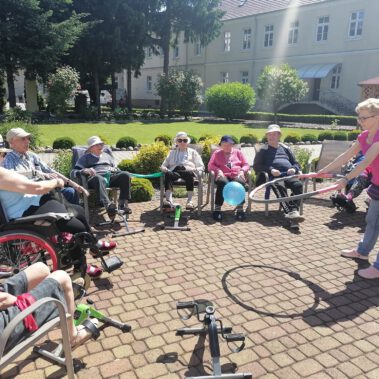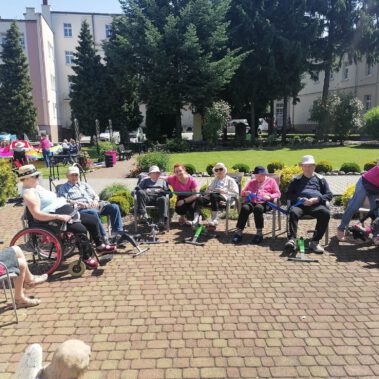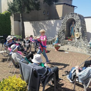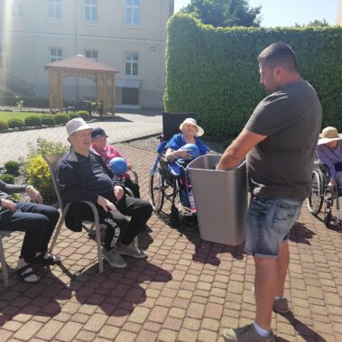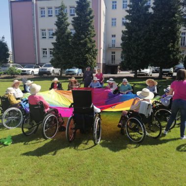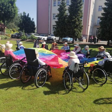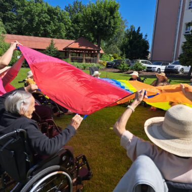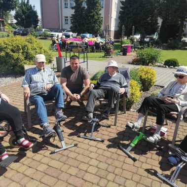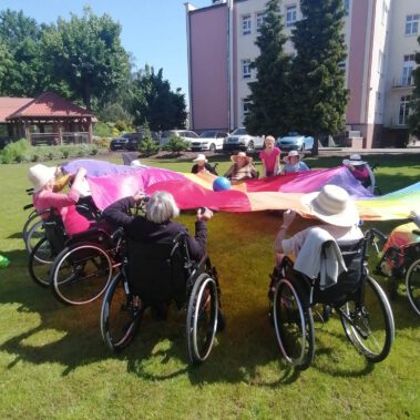 Pogoda piękna, słonko na niebie, w ogrodzie zielono a u nas wesoło…Sami zobaczcie- ćwiczymy, ruszamy się jak kto może przy dobrej muzyce. Oczywiście rewelacją była chusta klanzy. Dziś dziękujemy p. Szymonowi naszemu fizjoterapeucie i naszym Paniom Karolinie, Andżelice terapeutkom oraz p. Ani opiekunce za dzień sportu, który przyniósł nam tyle niezapomnianych wrażeń, radości, śmiechu, zadowolenia.