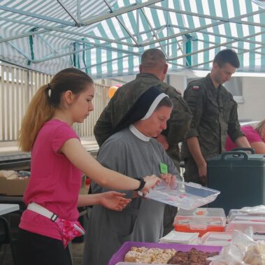 Oczywiście była wojskowa grochówka, którą żołnierze serwowali na stoisku oraz pyszności przygotowane przez nasz personel: ciasta, mufinki, chleb ze smalcem i ogórkiem oraz grilowane kiełbaski.