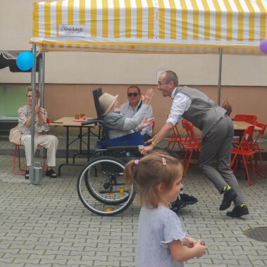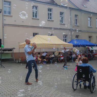 Impreza pod kierunkiem wodzireja Pana Grzegorza Stolarskiego była pełna śpiewu, tańca i coś dla dzieci czyli baniek mydlanych.