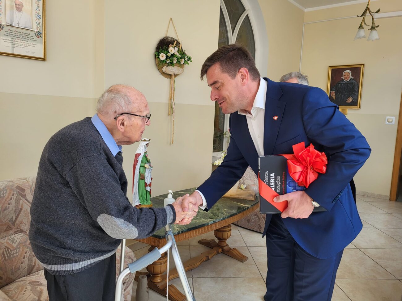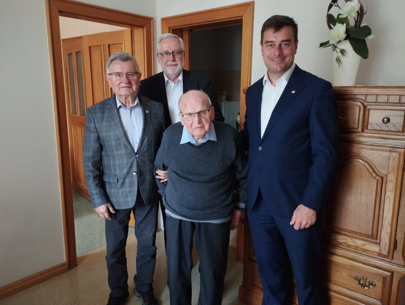 Dziś Pan Grzegorz Rusiecki prezydent Leszna oraz Pan Tomasz Malepszy członek Rady Miejskiej Leszna odwiedzili z życzeniami z okazji 99 Urodzin naszego Mieszkańca p. Stanisława Jędrasia.