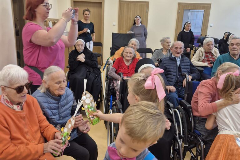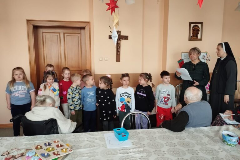Wczoraj w naszym domu było gwarno i wesoło! Wszystko to za sprawą dzieci z Przedszkola Sióstr Elżbietanek które odwiedziły naszych Mieszkańców z okazji zbliżających się Dnia Babci i Dziadka.
